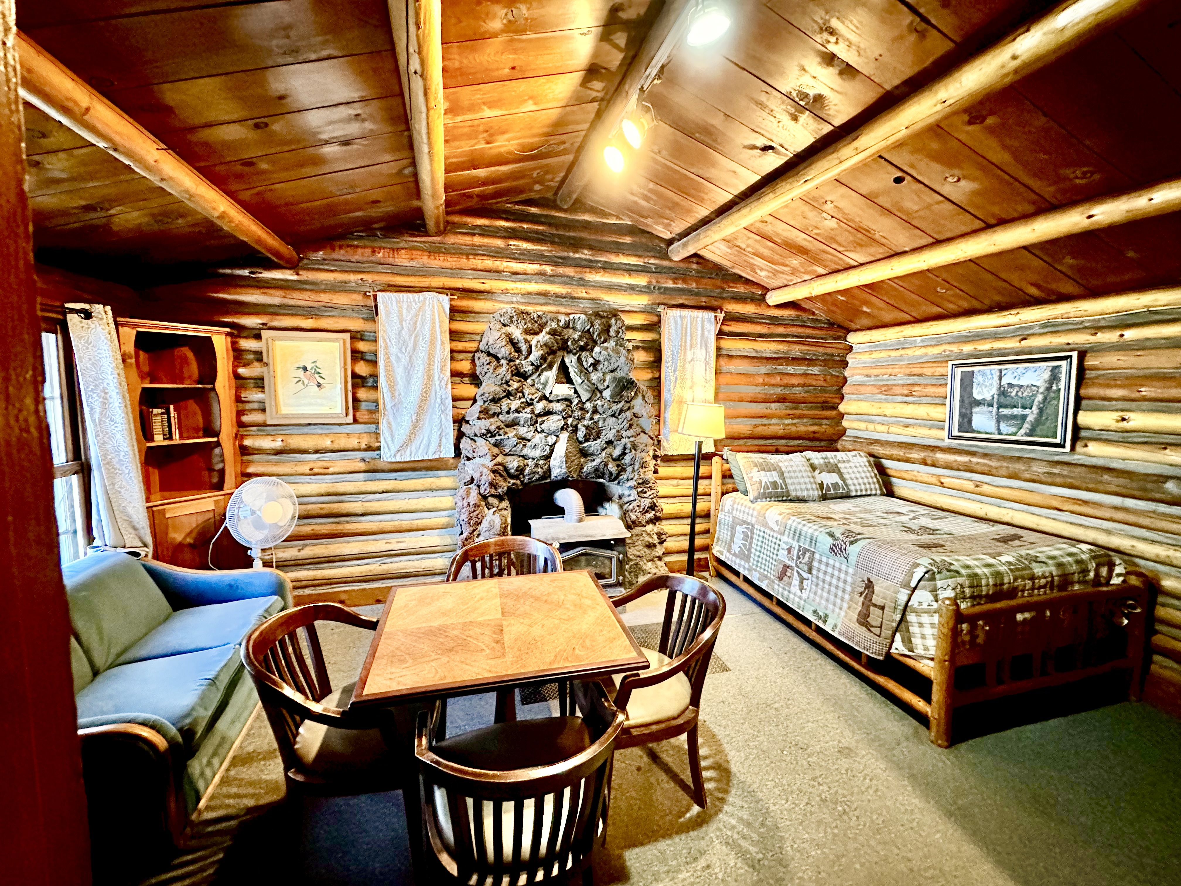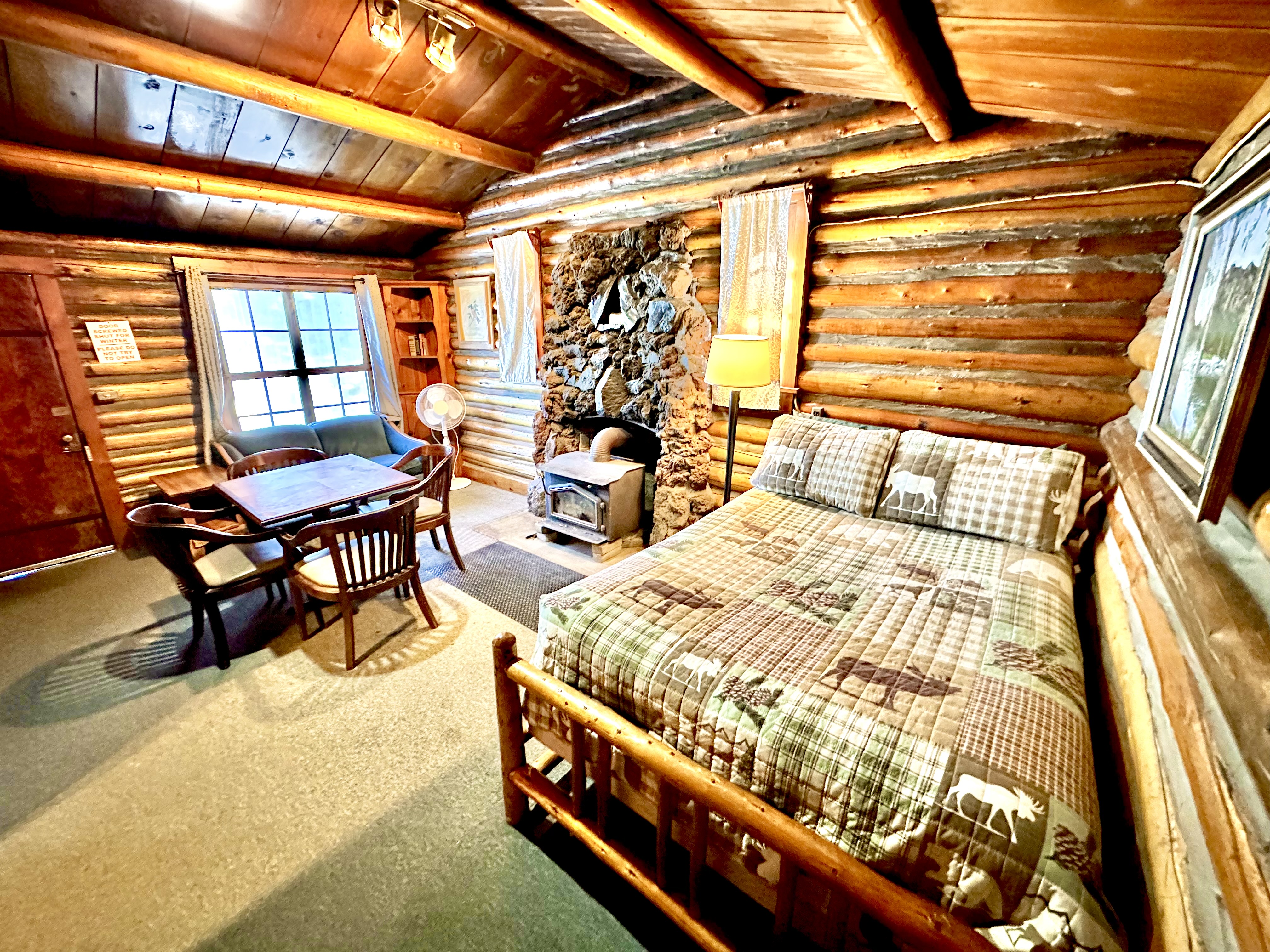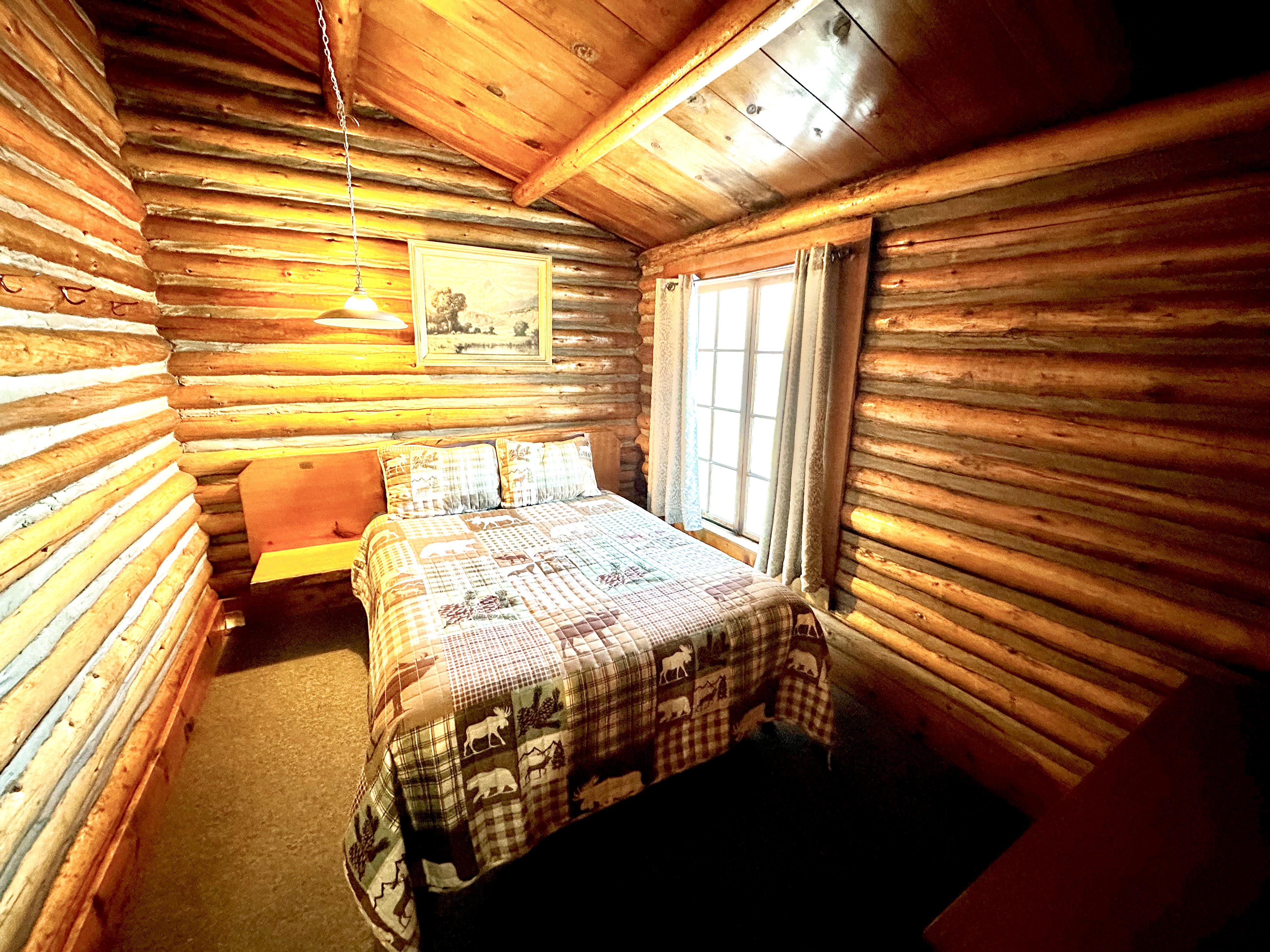 This historic rustic cabin offers one queen-sized bed in the bedroom and one double bed in the living room. The private bathroom has a shower and a full kitchen.